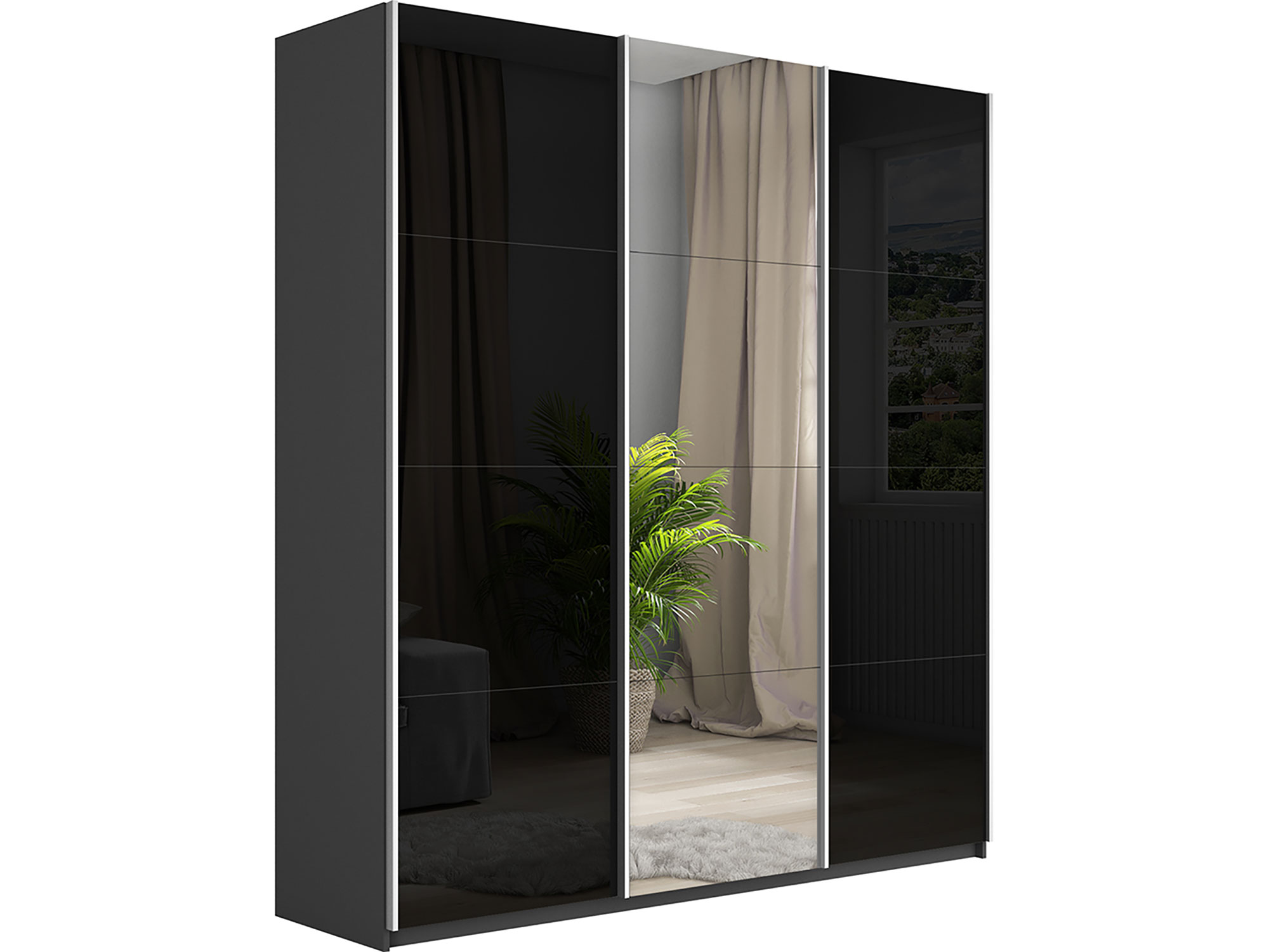 - Шкаф-купе Прайм Широкий 3-х дверный два черных стекла/зеркало Серый Диамант