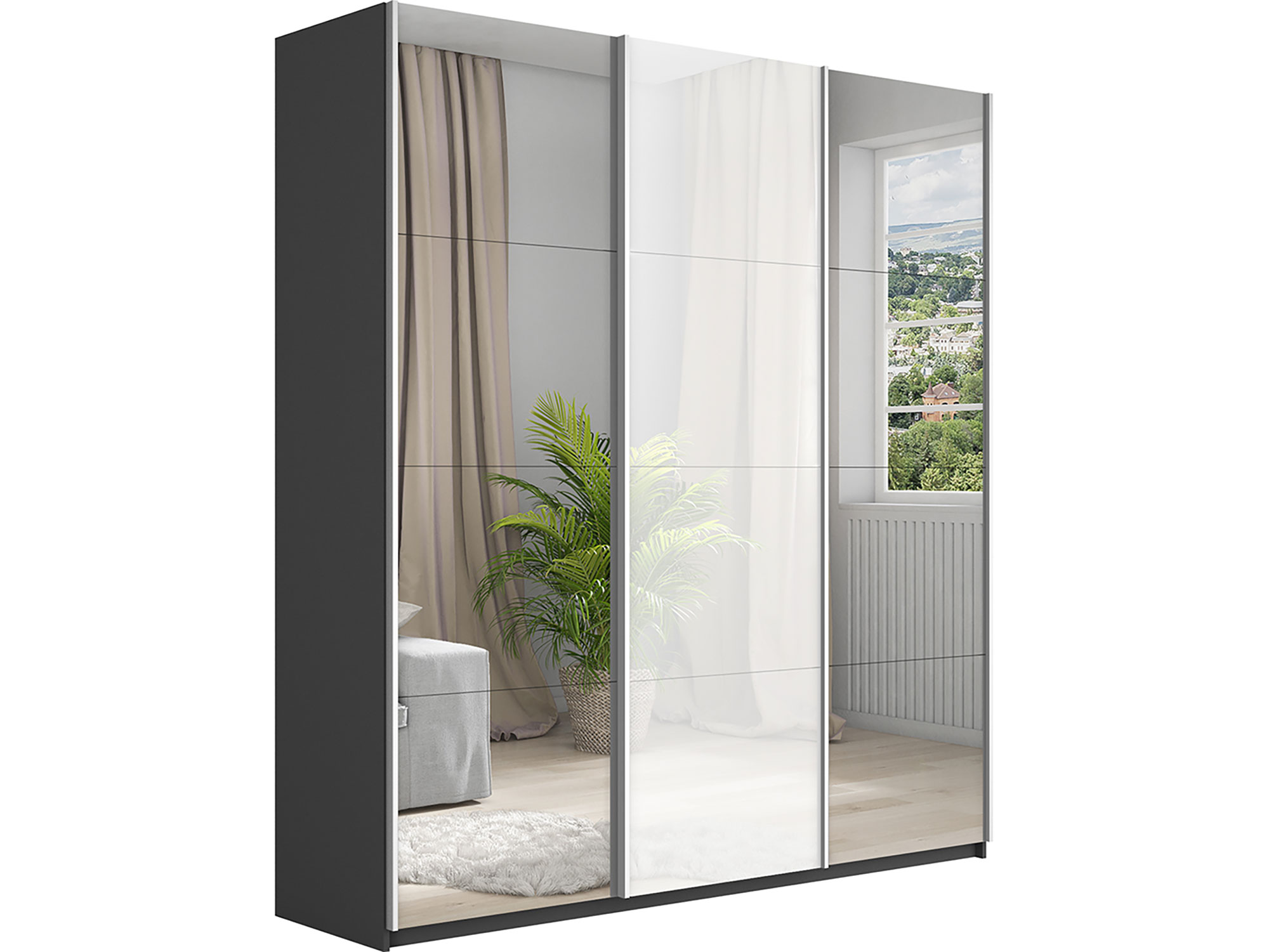 - Шкаф-купе Прайм Широкий 3-х дверный два зеркала/стекло белое Серый Диамант