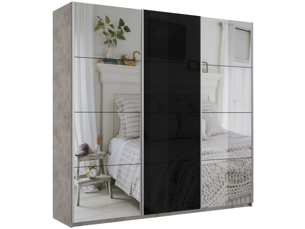 - Шкаф-купе Прайм Широкий 3-х дверный два зеркала/стекло черное Бетон